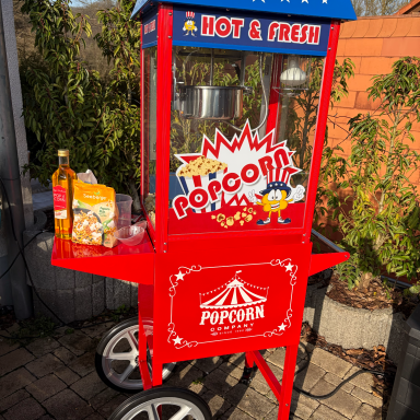 Popcornmaschine inkl. Zutaten. Zusatzverbrauch: Popcornmais 500 g = 8 € / Popcornöl 250 ml = 8 € / Popcornöl 500 ml = 14 € / brauner Zucker 500 g = 6 € je angebrochene Einheit.